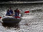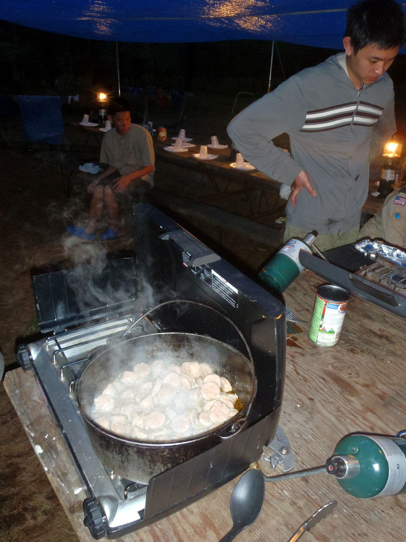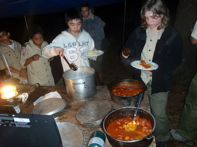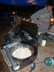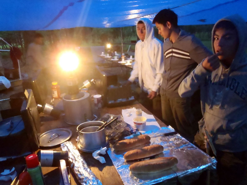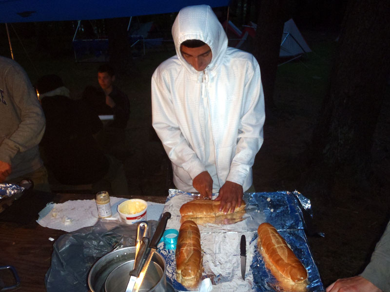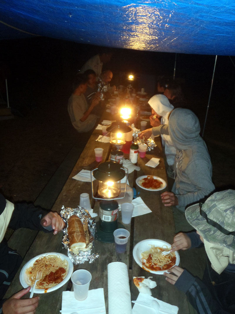 A very hearty dinner after a long day in the sun on the river, spicy and sweet sausages with spaghetti, meat sauce and garlic bread