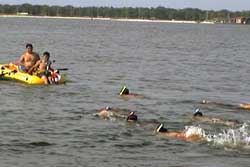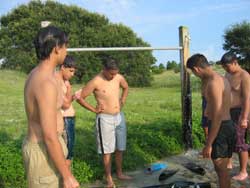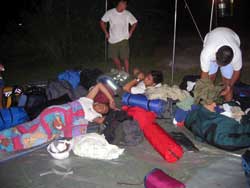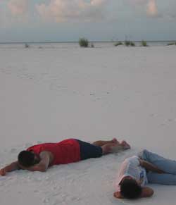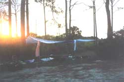 | Day 8 - Continued - Pensacola, FL After a full day dinner and laundry make for a long day. We decide to sleep under the tarp rather than set up the tents. Big mistake, the very hot night and bugs make it impossible for anyone to get much sleep. By the middle of the sleepless night a few of us walk to the beach on the gulf side of the island for a cooler spot. The constant breeze also keeps the bugs away. We get some sleep (2-3 hours), view a spectacular sunrise including a rainbow, and are constantly visited by members of the local feathered population. |