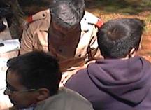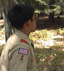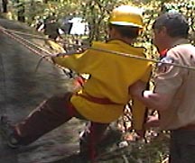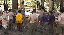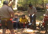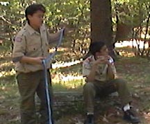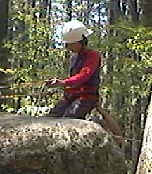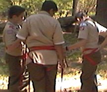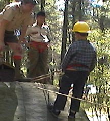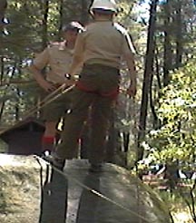| Pebble Rock While the food shopping crew are in town buying the grocery needs for the rest of the trip. The junior leaders and adult staff put on a clinic for the scouts who have never rappelled before. This is done on pebble rock, an eight foot rock in the back of our campsite. Here they receive the fundementals as well as intense safety training. After tying their own swiss seat, and waiting their turn patiently they get to practice the skills taught in class, hoping to be ready for Thunderhawk. |