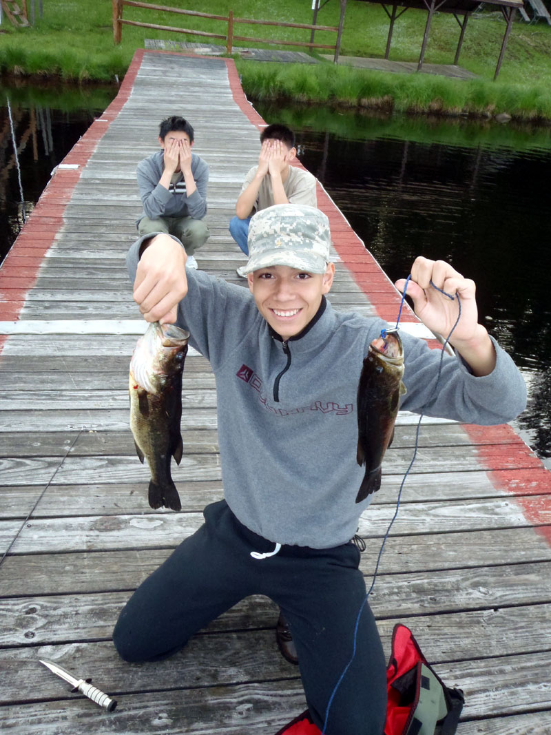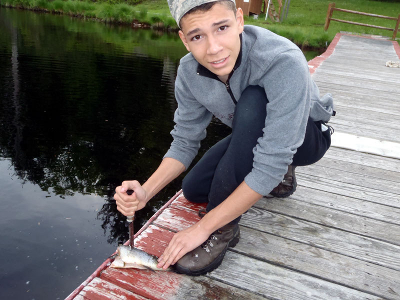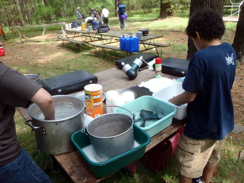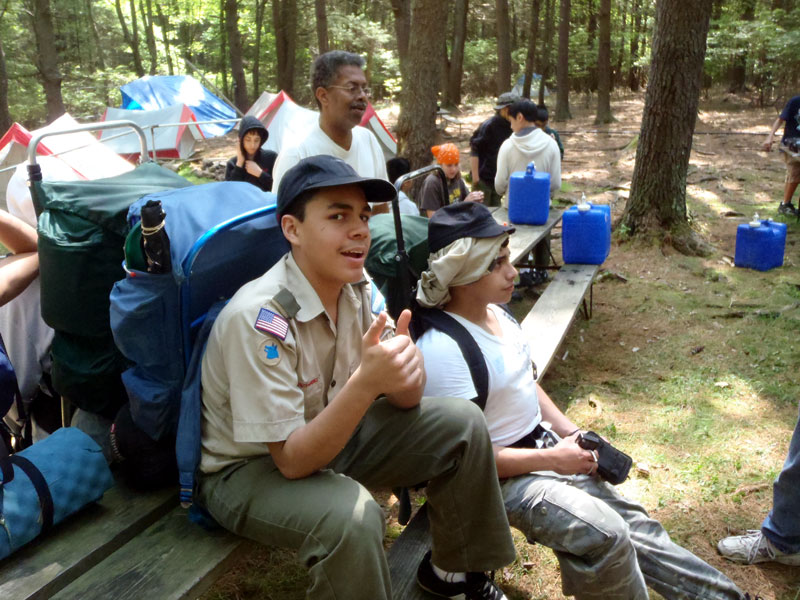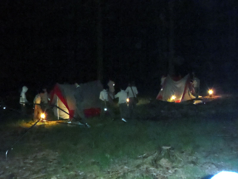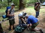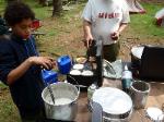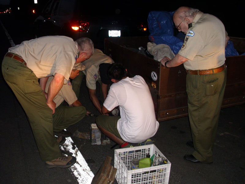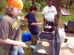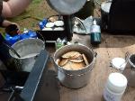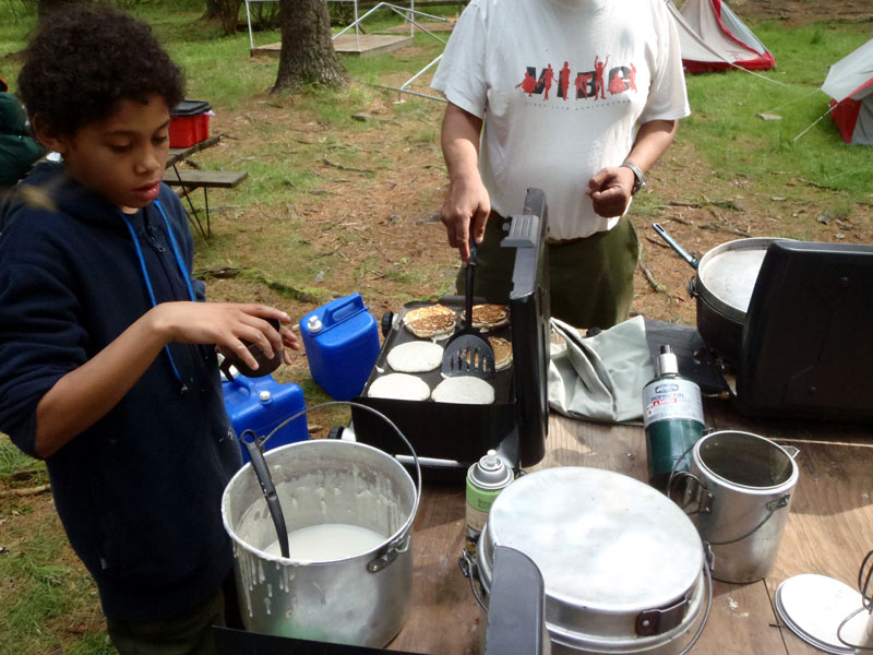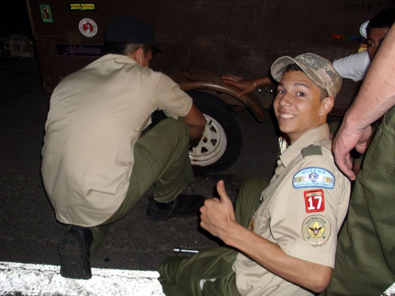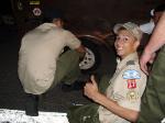 | Changing a flat on the trailer makes for a late camp set up, yet the scouts were early riser for the fish and breakfast |