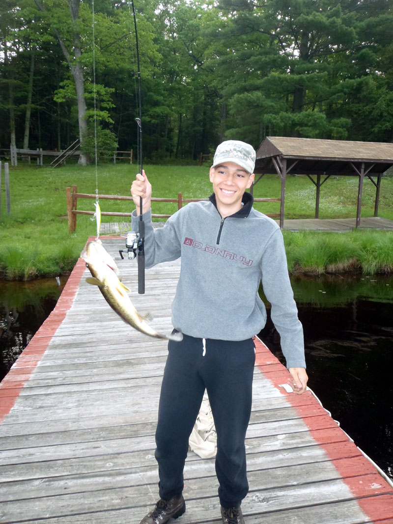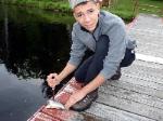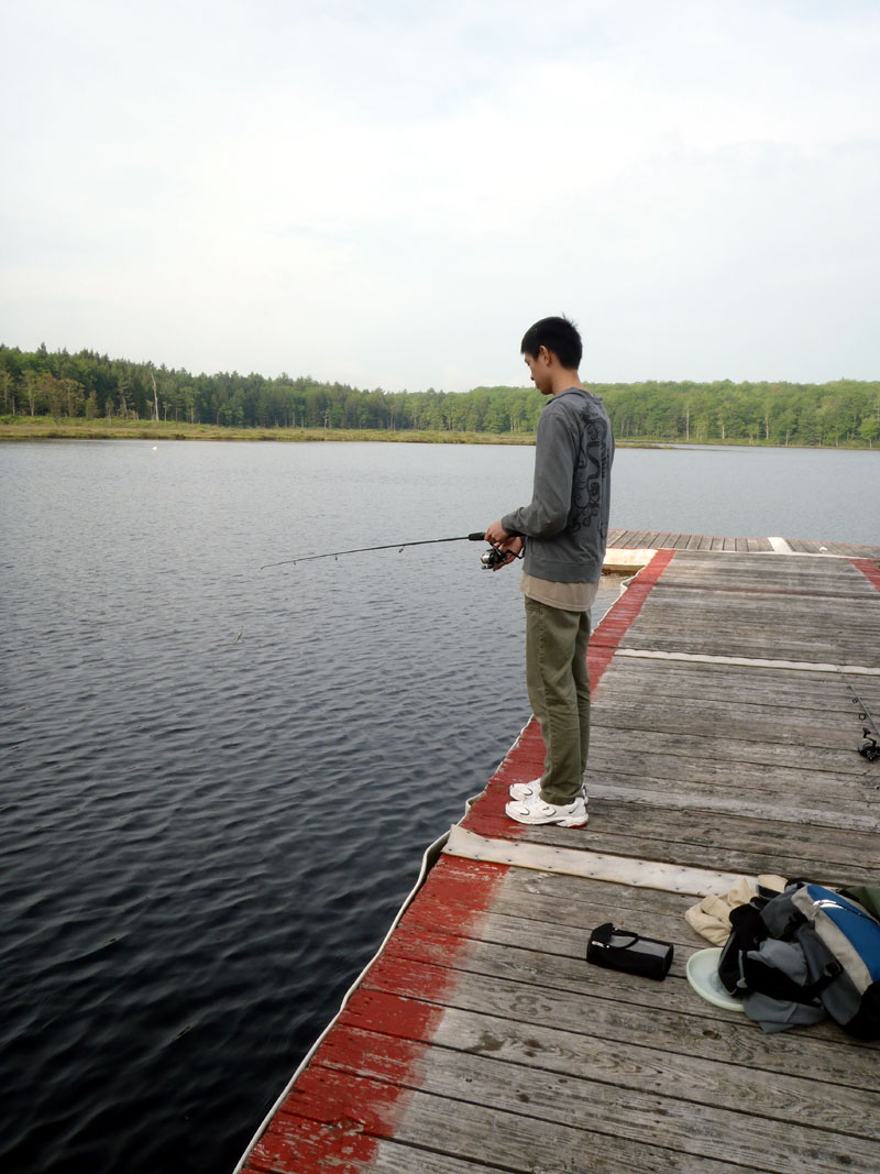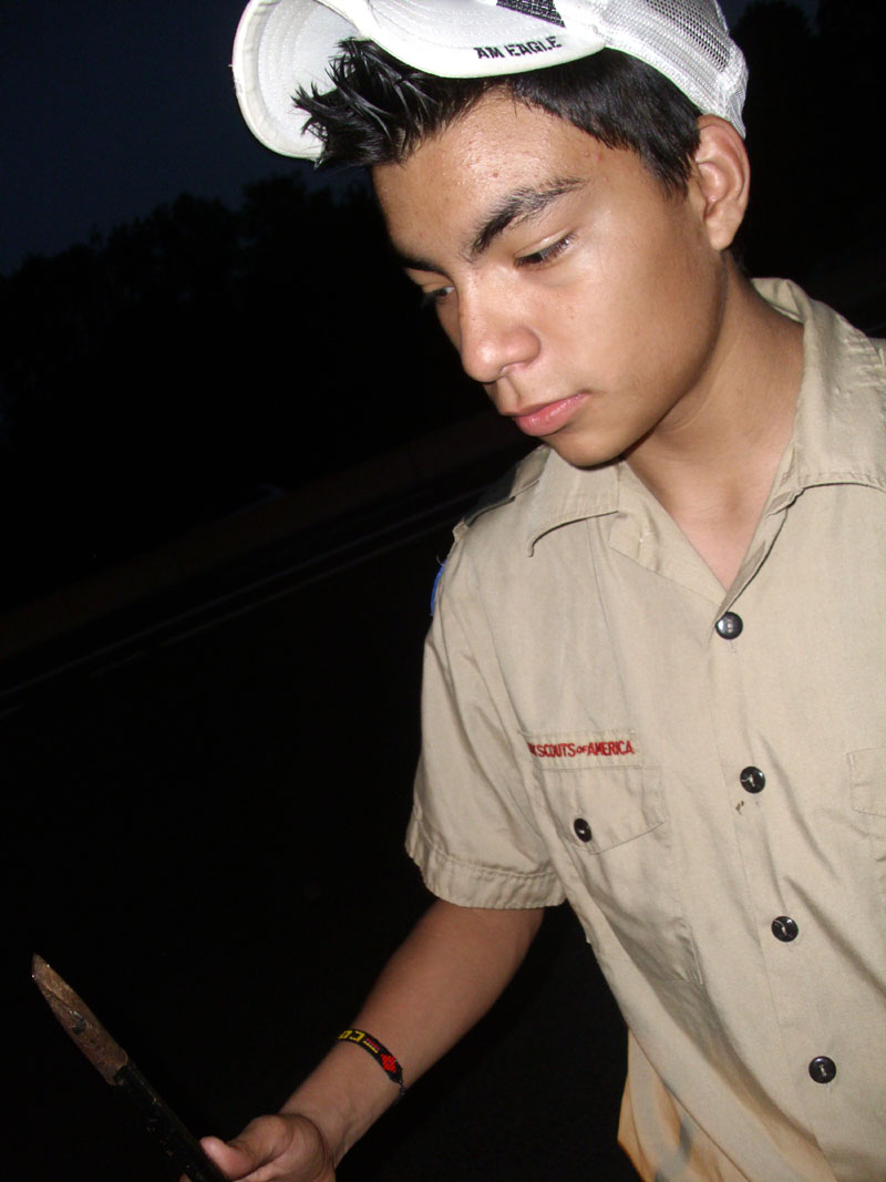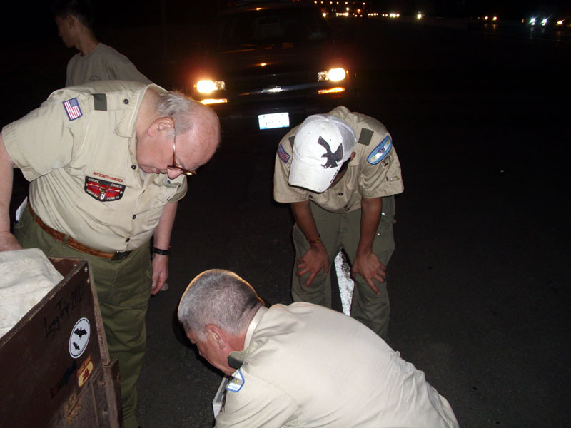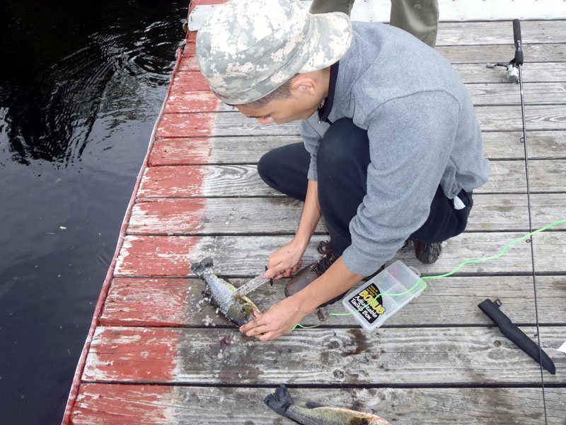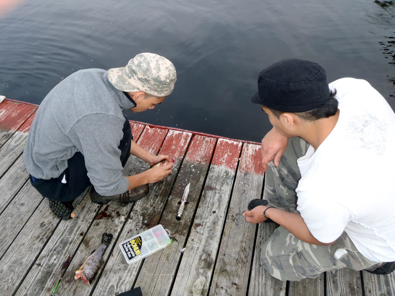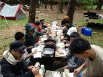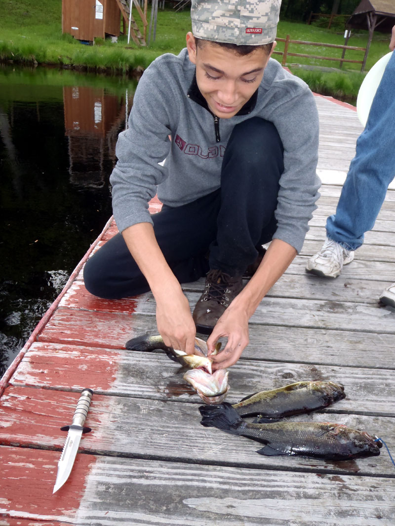| Changing a flat on the trailer makes for a late camp set up, yet the scouts were early riser for the fish and breakfast |