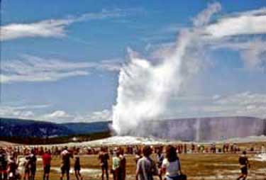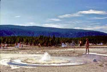 | August 1969, Yellowstone National Park Established in 1872, America's first national park. Located in Wyoming, Montana, and Idaho, home to grizzly bears, wolves, bison, and elk. Old Faithful and a collection of geysers and hot springs, and the Grand Canyon of the Yellowstone. |