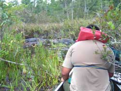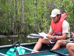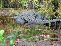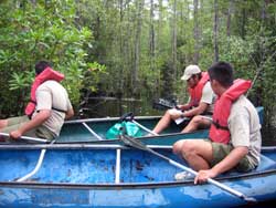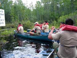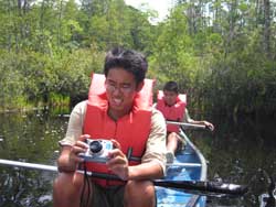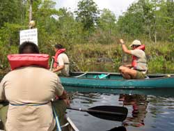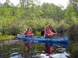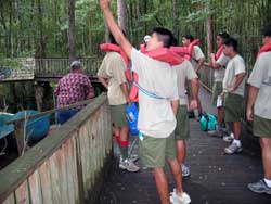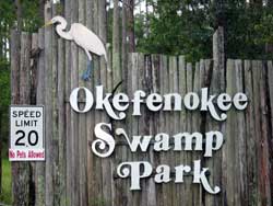 | Day 11 - Okefenokee Swamp Park, GA Short morning drive of 64 miles. But the trailer tires are not holding pressure so two of the adults will have to attend to it. The schedule calls for a canoe trip in the swamp with the Alligators. No problem, it appeared that there were not many other people interested in participating in this activity. They preferred the train ride or the guided motoboat outing. Our scouts and young adults had no second thoughts, they were determined to go out on their own. |