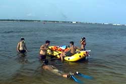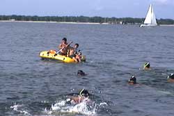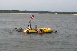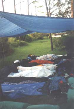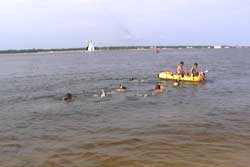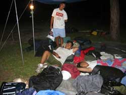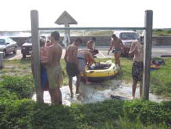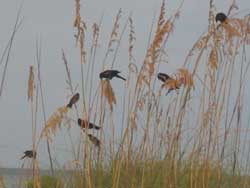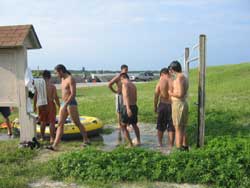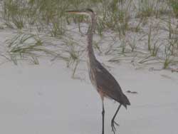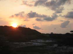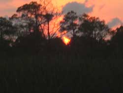 | Day 8 - Continued - Pensacola, FL After a full day dinner and laundry make for a long day. We decide to sleep under the tarp rather than set up the tents. Big mistake, the very hot night and bugs make it impossible for anyone to get much sleep. By the middle of the sleepless night a few of us walk to the beach on the gulf side of the island for a cooler spot. The constant breeze also keeps the bugs away. We get some sleep (2-3 hours), view a spectacular sunrise including a rainbow, and are constantly visited by members of the local feathered population. |