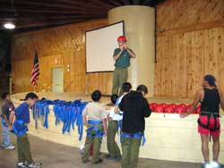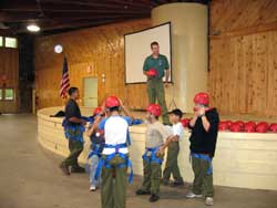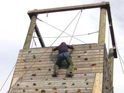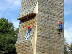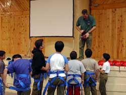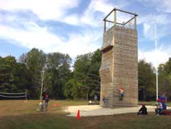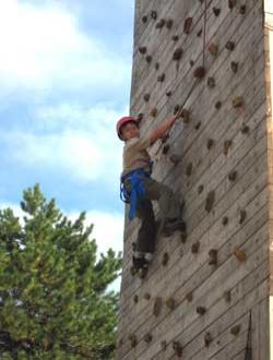 | Saturday Afternoon- Most of the afternoon was spent on the climbing wall. The returning scouts spent the day honing their acquired skills, while the newer members tried to negotiate the wall for the first time, the second time, the third time... As you can see it is a challenging and fun activity. Everyone who wanted to try had several chances at the wall. Most, including some of the first timers were able to reach the top more than once. The more experienced climbers are even competing on who can get to the top in the best time. |