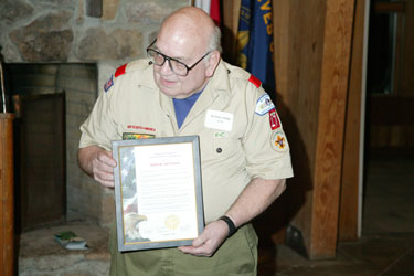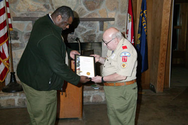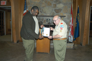 | Dwain Frazier, Pathfinder District Executive, presenting Ralph the "Pathfinder District Lifetime Achievement Award " |