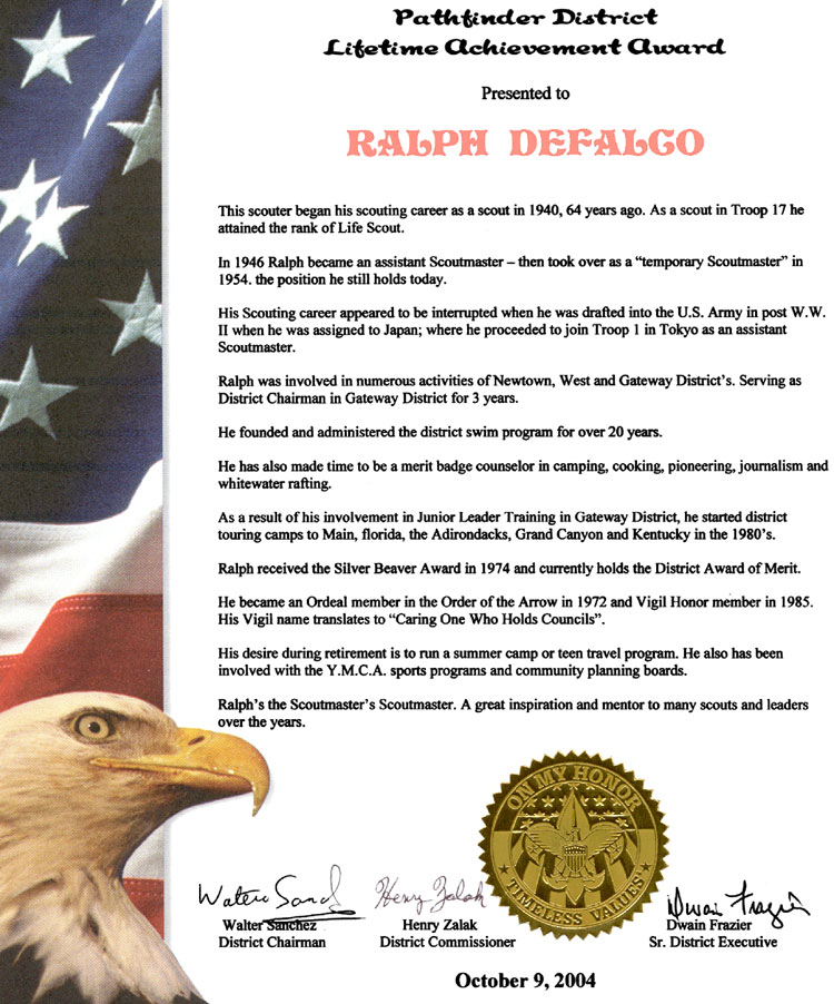 | Pathfinder District's Lifetime Achievement Award as Presented to Ralph De Falco |