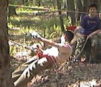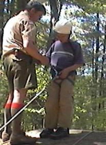 | Pebble Rock While the food shopping crew are in town buying the grocery needs for the rest of the trip. The junior leaders and adult staff put on a clinic for the scouts who have never rappelled before. This is done on pebble rock, an eight foot rock in the back of our campsite. Here they receive the fundementals as well as intense safety training. After tying their own swiss seat, and waiting their turn patiently they get to practice the skills taught in class, hoping to be ready for Thunderhawk. |